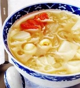 銀耳含有豐富的膳食纖維,可清腸胃減少腸道吸收脂肪,并促進排宿便,是優質的減肥食品。如果得了結膜炎,可以多喝些銀耳羹有一定的輔助治療功效。 材料