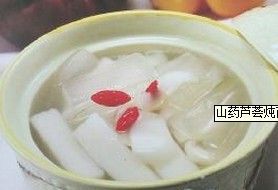 用料原材料:白山藥50克,蘆薈150克,百合50克,清水500克。調(diào)味料:冰糖20克。