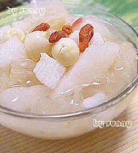 材料 銀耳,蓮子,枸杞水泡發,山藥小半根,陽信鴨梨1個去皮切小塊,冰糖少許