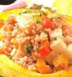 2.米飯拌入南瓜丁和山藥丁加入鹽適量,醬油適量調味后填入南瓜內,用保鮮膜包住,移入蒸鍋內中火蒸15分鐘即可