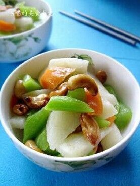 小貼士:萵筍含鉀量較高,有利于促進排尿,對高血壓和心臟病極為有益。能改善消化系統,增進食欲山藥有健脾,除濕,補氣,益肺,固腎,益精的功效。含有可溶性纖維,能助消化,降血糖 腰果含有豐富的油脂,可以潤腸通便,潤膚美容,延緩衰老。經常食用可以提高機體抵抗力。
