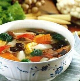 白山藥鮮蔬湯做法介紹 根據中國傳統食療說法,五色入五臟。這道素湯中用到了:青(青花菜)、赤(胡蘿卜)、黃(玉米)、白(山藥)和黑(黑木耳),稱得上五色俱全,可以全方位地增進健康。