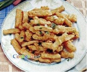山藥掛糊時不宜太厚,下鍋時要撒開以免粘連。