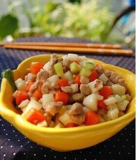 3.再起油鍋,先入胡蘿卜丁,后入山藥和黃瓜丁,翻炒片刻后加入炒好的肉丁,炒勻后加鹽和糖調味后即可出鍋