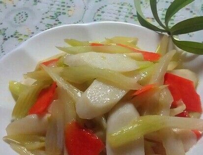 2.把西芹切斜段,山藥切片,來配上點紅蘿卜增加點色彩與營養。